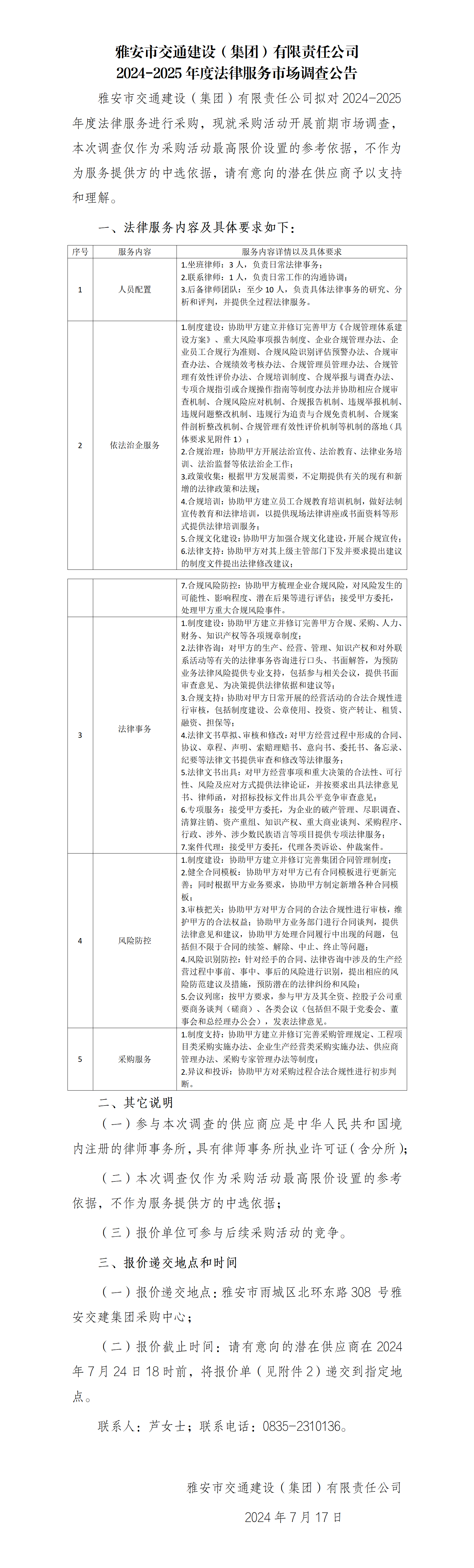 雅安市交通建設(shè)(集團(tuán))有限責(zé)任公司2024-2025年度法律服務(wù)市場(chǎng)調(diào)查公告