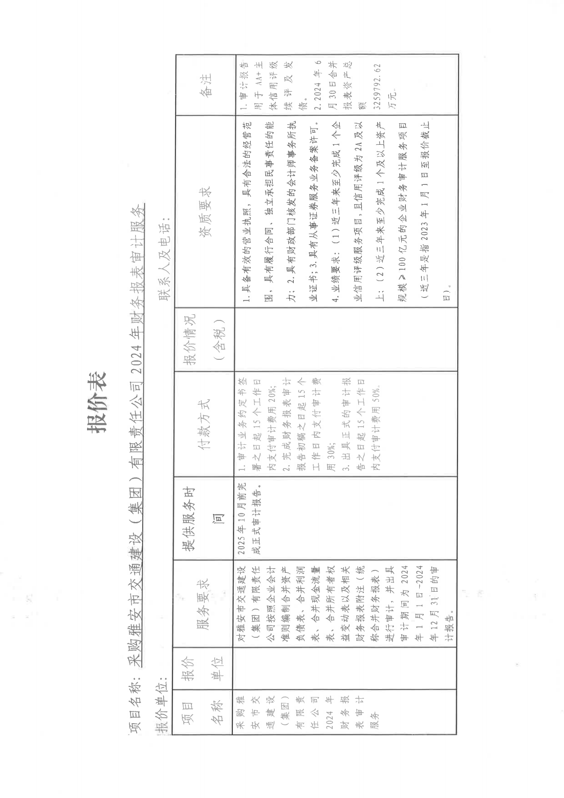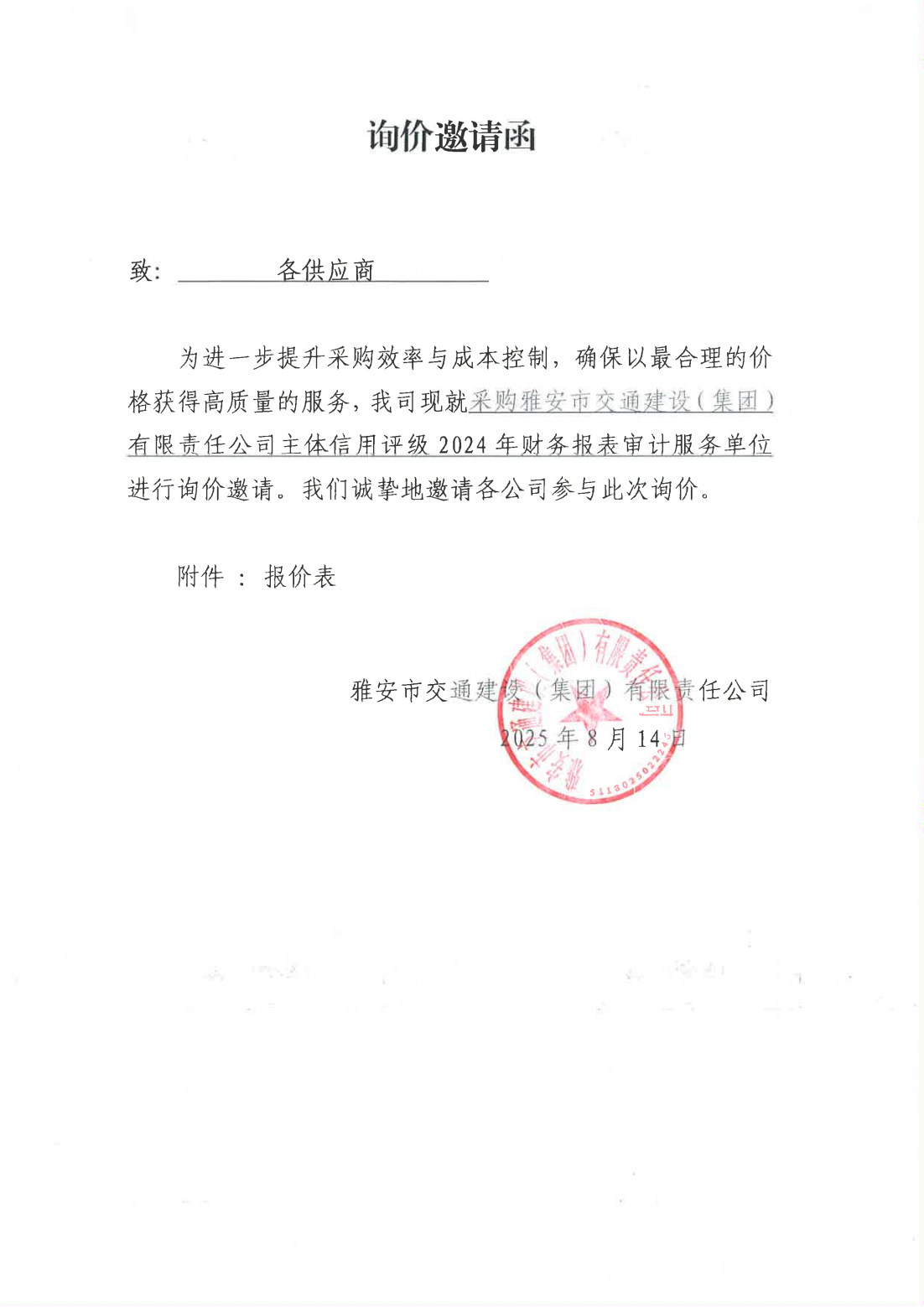 關(guān)于采購雅安市交通建設(shè)(集團(tuán))有限責(zé)任公司主體信用評級2024年財務(wù)報表審計服務(wù)單位的詢價函