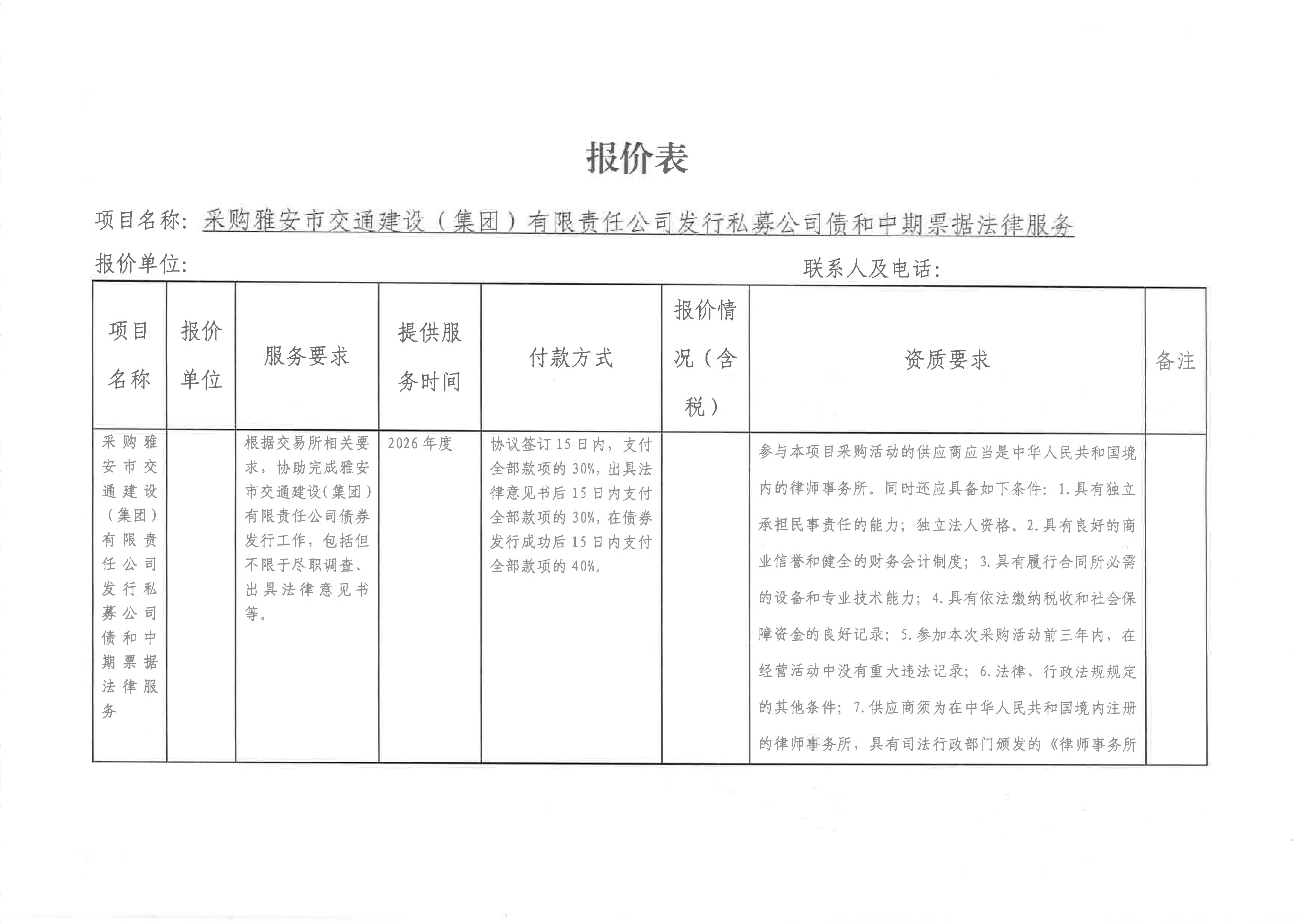 關(guān)于雅安市交通建設(shè)(集團(tuán))有限責(zé)任公司發(fā)行私募公司債和中期票據(jù)所需法律服務(wù)采購(gòu)限價(jià)的詢價(jià)函