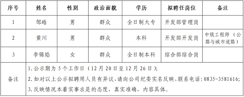 雅安交建集團(tuán)大興交通開發(fā)有限公司擬聘用人員公示