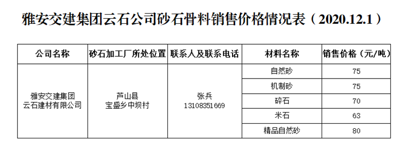 雅安交建集團云石公司砂石骨料銷售價格情況表(2020.12.1)