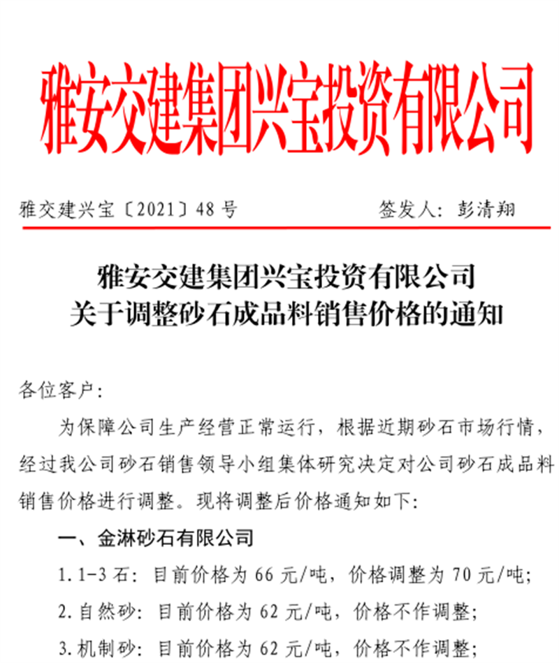 雅安交建集團興寶公司砂石骨料銷售價格情況表(2021.8.12)