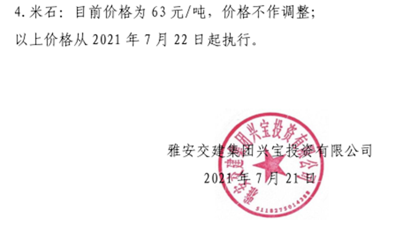 雅安交建集團興寶公司砂石骨料銷售價格情況表(2021.7.22)