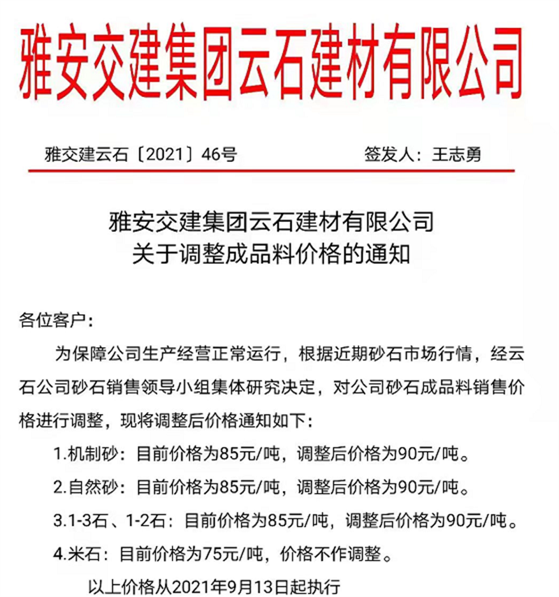 雅安交建集團(tuán)云石公司關(guān)于調(diào)整成品料銷(xiāo)售價(jià)格的通知(2021.9.13)