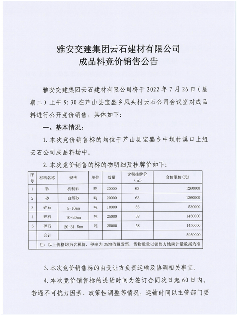 雅安交建集團云石建材有限公司成品料競價銷售公告