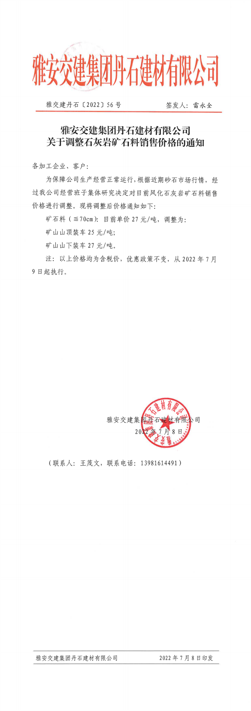 雅交建丹石關(guān)于調(diào)整石灰?guī)r礦石料銷售價(jià)格的通知(2022-7-8)