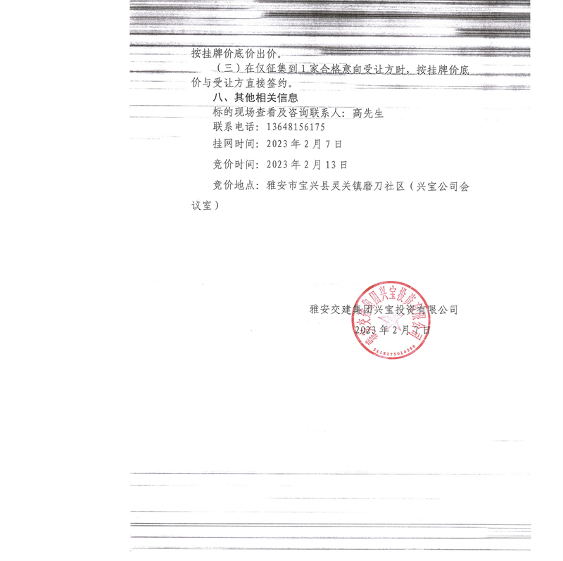 雅安交建集團(tuán)興寶投資有限公司100萬噸可利用棄渣競價(jià)銷售流標(biāo)公告(2023.2.13)