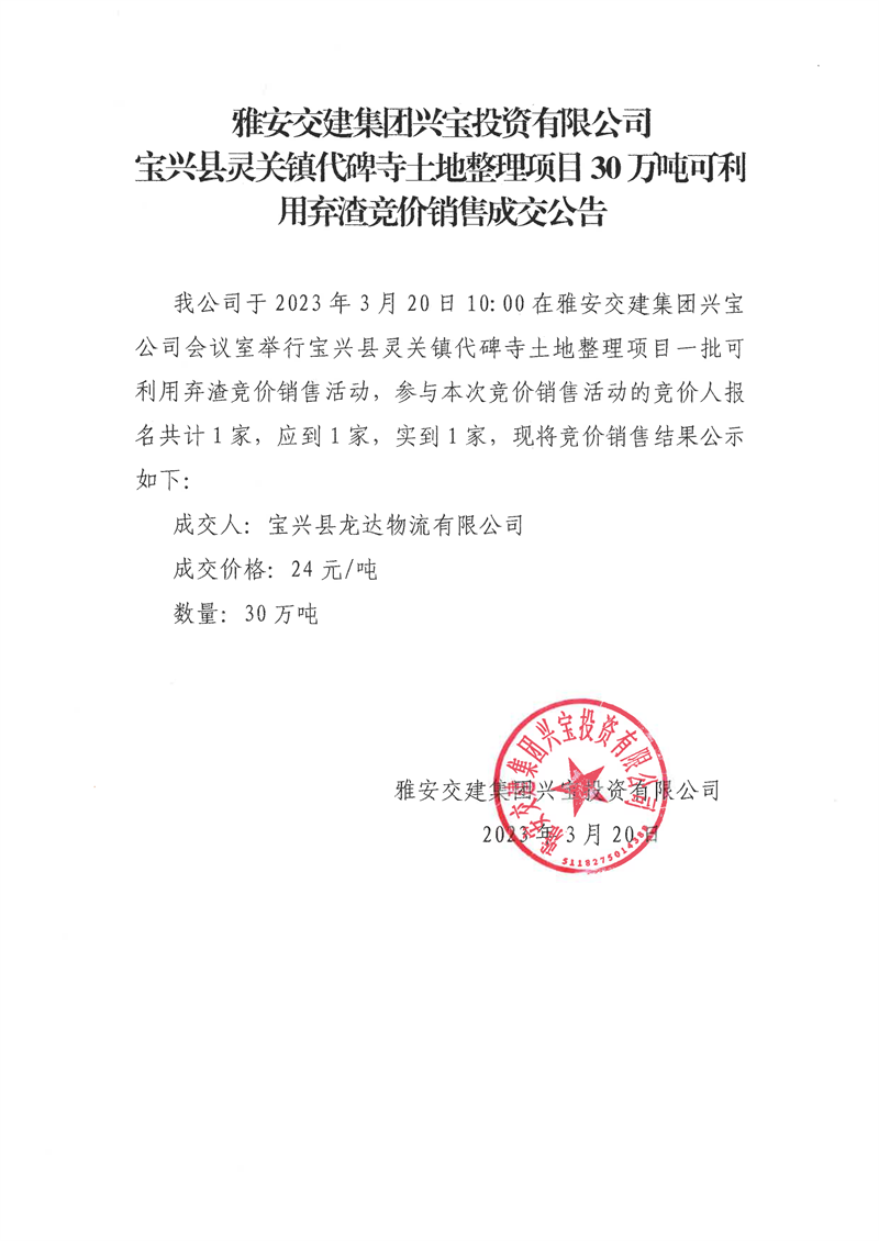 雅安交建集團(tuán)興寶投資有限公司靈關(guān)鎮(zhèn)代碑寺土地整理項(xiàng)目30萬(wàn)噸可利用棄渣競(jìng)價(jià)銷(xiāo)售成交公告(2023.3.20)