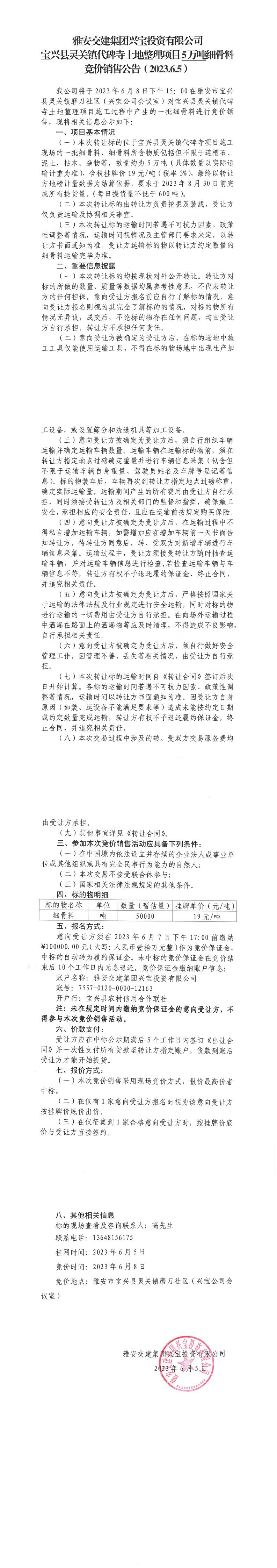 雅安交建集團興寶投資有限公司寶興縣靈關鎮(zhèn)代碑寺土地整理項目5萬噸細骨料競價銷售公告(2023.6.5)