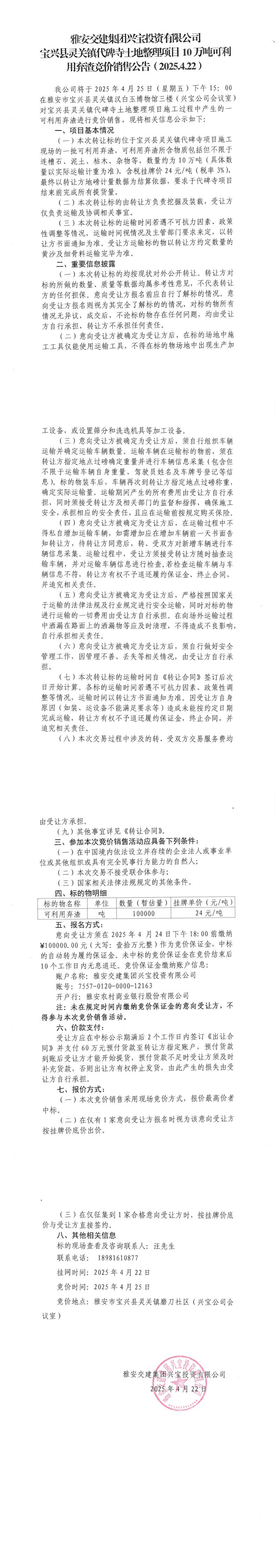 雅安交建集團興寶投資有限公司寶興縣靈關(guān)鎮(zhèn)代碑寺土地整理項目10萬噸可利用棄渣競價銷售公告
